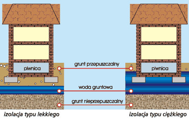 - izolacja typu ciężkiego (przeciwwodna) - wykonywana w przypadku posadowienia budynku poniżej lustra wody gruntowej i w przypadku gruntów spoistych, izolacja ta jest dosyć droga - ze względu na napór wody gruntowej wymaga stosowania materiałów o dużej szczelności i wytrzymałości, specjalnej podłogi w piwnicy z betonową lub żelbetonową płytą obciążającą oraz ścianki dociskowej izolacji pionowej. W związku z tym należy zastanowić się nad zasadnością podpiwniczania budynku w przypadku takich warunków geologicznych.