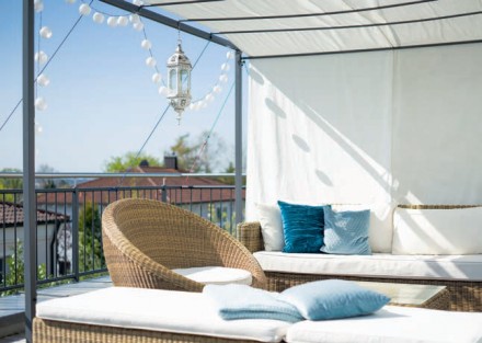Na to, czy światło spełni swoją funkcję, wpływ ma również miejsce, w którym zostanie zamontowane, nie może być ono przypadkowe. Jeśli decydujemy się na kinkiety, znaczenie ma wysokość ich mocowania. Najczęściej oprawy kierujące strumień światła w dół instaluje się na wysokości górnej krawędzi drzwi balkonowych, podobnie mocuje się te, które kierują równocześnie światło w dół i ku górze. W przypadku opraw otwartych tylko ku górze lepiej zamontować je niżej, także wówczas warto znaleźć punkt odniesienia. Oświetlenie górne zaprojektowane w dachu tarasu czy podbitce wysuniętego okapu montujemy nad stołem lub w aneksie, w którym zaplanowaliśmy strefę wypoczynku, np. ustawiliśmy kanapę lub fotele. Jeśli chcemy zastosować lampy o długim zwisie, to pamiętajmy, że sprawdzą się one jedynie w miejscach zacisznych, nienarażonych na silne podmuchy wiatru. Równie często stosujemy w zadaszeniu tarasu czy balkonu oświetlenie rozmieszczone punktowo. Punkty świetlne mogą być usytuowane w równo oddalonej odległości lub też zgrupowane blisko siebie oświetlając np. tylko stół czy kanapę. Gdy decydujemy się na rytmicznie, szeregowo zainstalowane oprawy, to nie powinny być one położone zbyt blisko, mogą bowiem wówczas zbyt jaskrawo oświetlać wnętrza pomieszczeń graniczących z tarasem lub balkonem. Dyskretne światło zapewni montaż opraw w podłodze. W tym miejscu umieszcza się je w równo oddalonych punktach. W przypadku tarasów można także zaplanować oświetlenie na rabatach lub ścieżkach graniczących z nimi. Wówczas taras zostanie optycznie powiększony. O tym, w jakim stopniu będzie wtedy oświetlona nasza strefa wypoczynku, decyduje nie tylko liczba lamp, ale też ich wysokość – im będą one wyższe, tym większy będzie ich zasięg. Tu wykorzystuje się często lampy solarne mocowane na słupkach, które można wbić w ziemię. Najbardziej swobodne jest usytuowanie ruchomych lamp stojących, których położenie może się zmieniać.