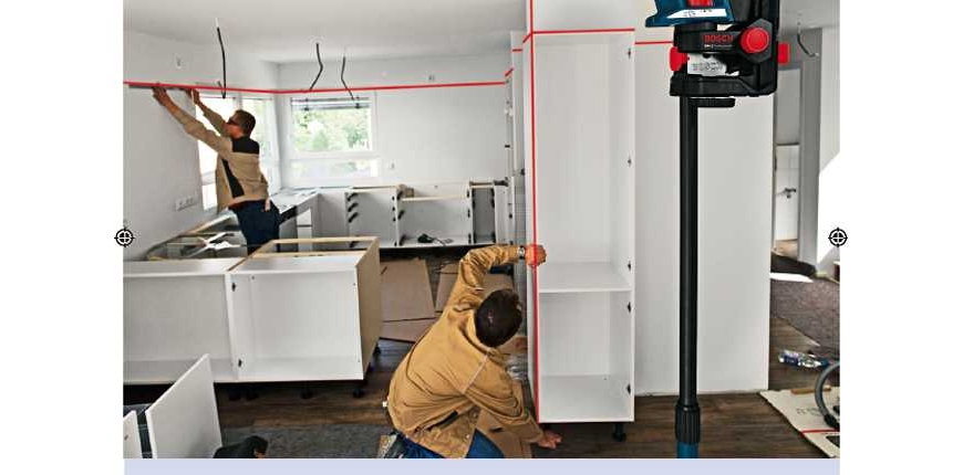 Korzystając z lasera pracującego w trybie emisji dwóch płaszczyzn poziomych i jednej pionowej można ustawić oraz zawiesić np. szafki kuchenne.