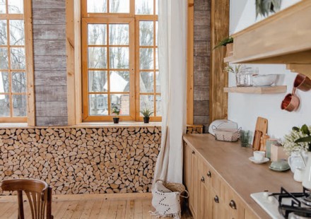 W domu z drewna można wykorzystać do wykończenia i dekoracji również kawałki drewna opałowego. Ściśle ułożone szczapy i polana przeznaczone do palenia w kominku wciśnięte w ramę z drewna dowolnej wielkości ozdobią ścianę domu wybudowanego bala lub wykończonego boazerią. Żeby zapas opału był efektowną dekoracją, wystarczy z wyczuciem uporządkować gromadzone do palenia kawałki drewna, wykorzystując różnice w rozmiarach, kształtach i kolorystyce szczap. Ścianka z drewnianych polan stanowi dynamiczną dekorację – w sezonie zimowym, gdy wyciągamy z niej drewno do kominka, szybko zmienia swoją formę. Może ją odzyskać, gdy zapas drewna ponownie uzupełnimy.