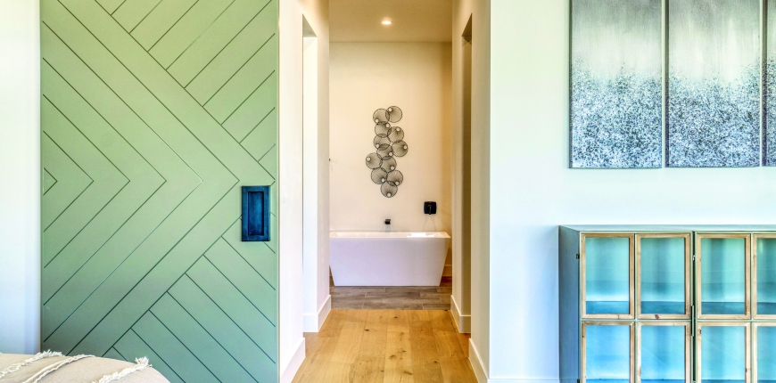Drugi sposób na wyróżnienie drzwi łazienkowych to postawienie na zupełnie inny materiał niż pozostałe skrzydła. W łazience z elementami stylu rustykalnego sprawdzą się drewniane z wyeksponowanym rysunkiem słojów. Drewno użyte do wykonania drzwi łazienkowych musi być odpowiedniej jakości i dobrze zabezpieczone – najlepiej sprawdzi się klejone. Mogą być też wyposażone w przeszklenia w postaci jednej matowej tafli lub kilku mniejszych. W łazienkach osobistych położonych przy sypialniach można sobie pozwolić na całkowicie przezroczystą taflę szkła, ale gdy pomieszczenie użytkowane jest przez całą rodzinę i gości, pamiętajmy o zachowaniu prywatności. Nic nie stoi na przeszkodzie, by w wyborze designu drzwi jeszcze dalej poeksperymentować z materiałem. Odporne na zarysowania, uszkodzenia oraz wilgoć będą drzwi wykończone spiekiem kwarcowym. Materiał ten często przypomina okładziny z naturalnego kamienia czy polerowanego betonu, pozwala więc uzyskać jedyny w swoim rodzaju niepowtarzalny wygląd skrzydła. Cienka, około 10-milimetrowa warstwa okładziny nałożona na drzwi o konstrukcji płytowej będzie elementem mocno przykuwającym uwagę, drzwi robią też wrażenie solidnych, choć są zarazem lekkie. W ten sposób można wykończyć skrzydła nie tylko rozwieralne, ale też przesuwne czy składane.
